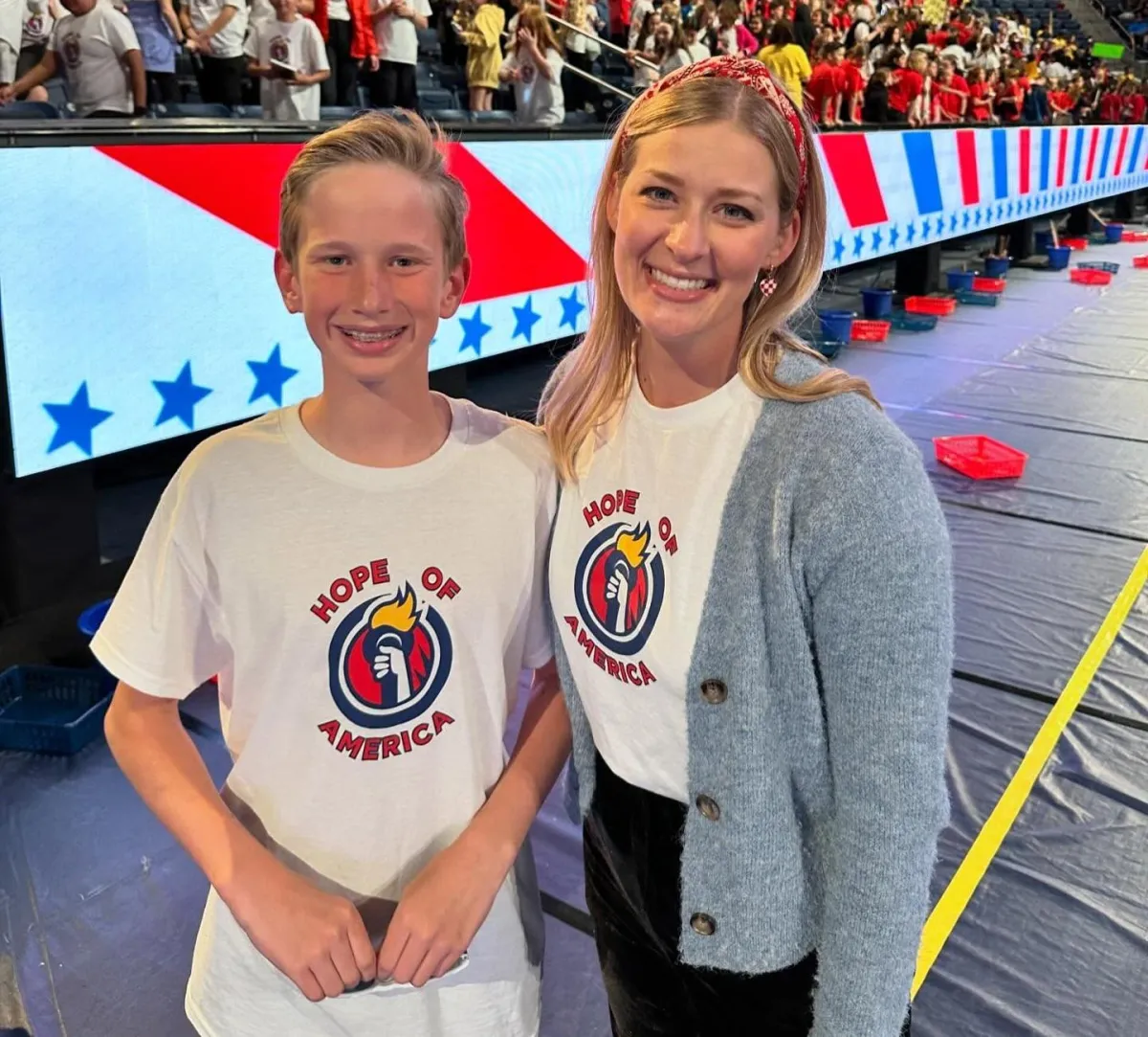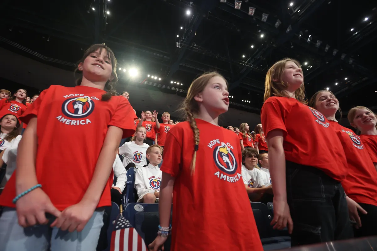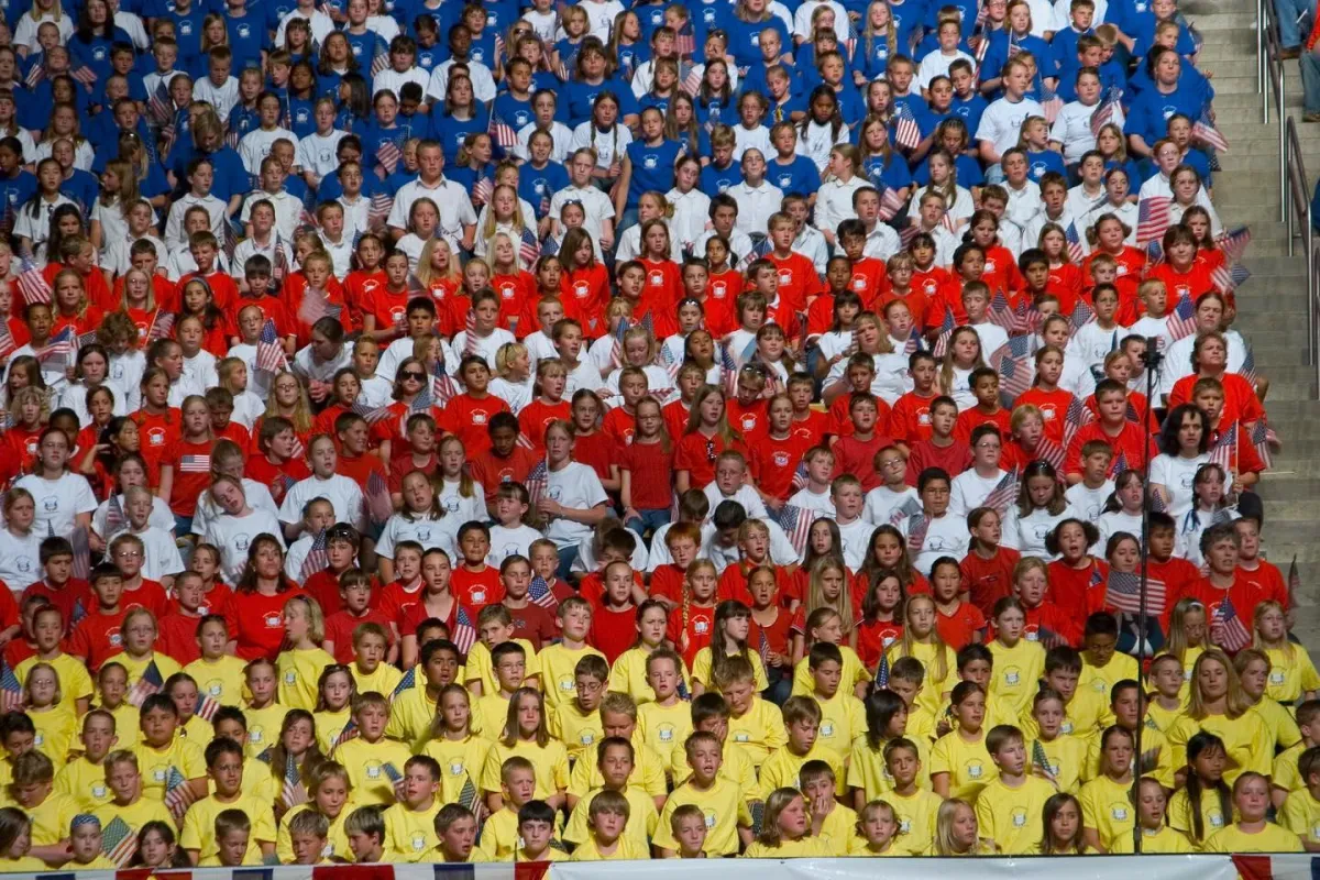 The Hope of America is a patriotic event that brings together thousands of fifth-grade students from over 100 schools to perform songs celebrating hope, patriotism, and service. The performances take place over three days at the Marriott Center.